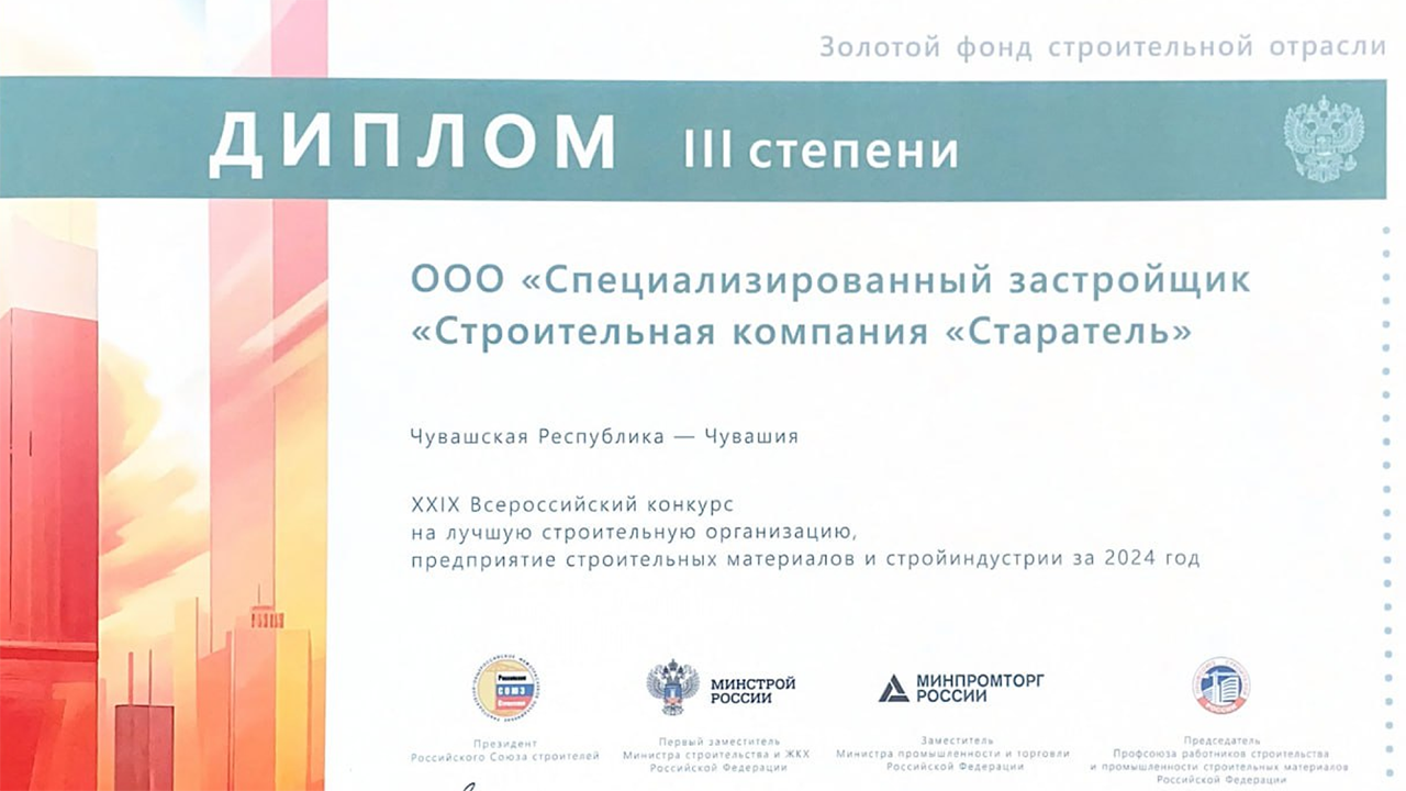 Наша компания вошла в Золотой фонд строительной отрасли России. Мы получили диплом III степени на XXIX Всероссийском конкурсе как одно из лучших предприятий строительной индустрии за 2024 год.